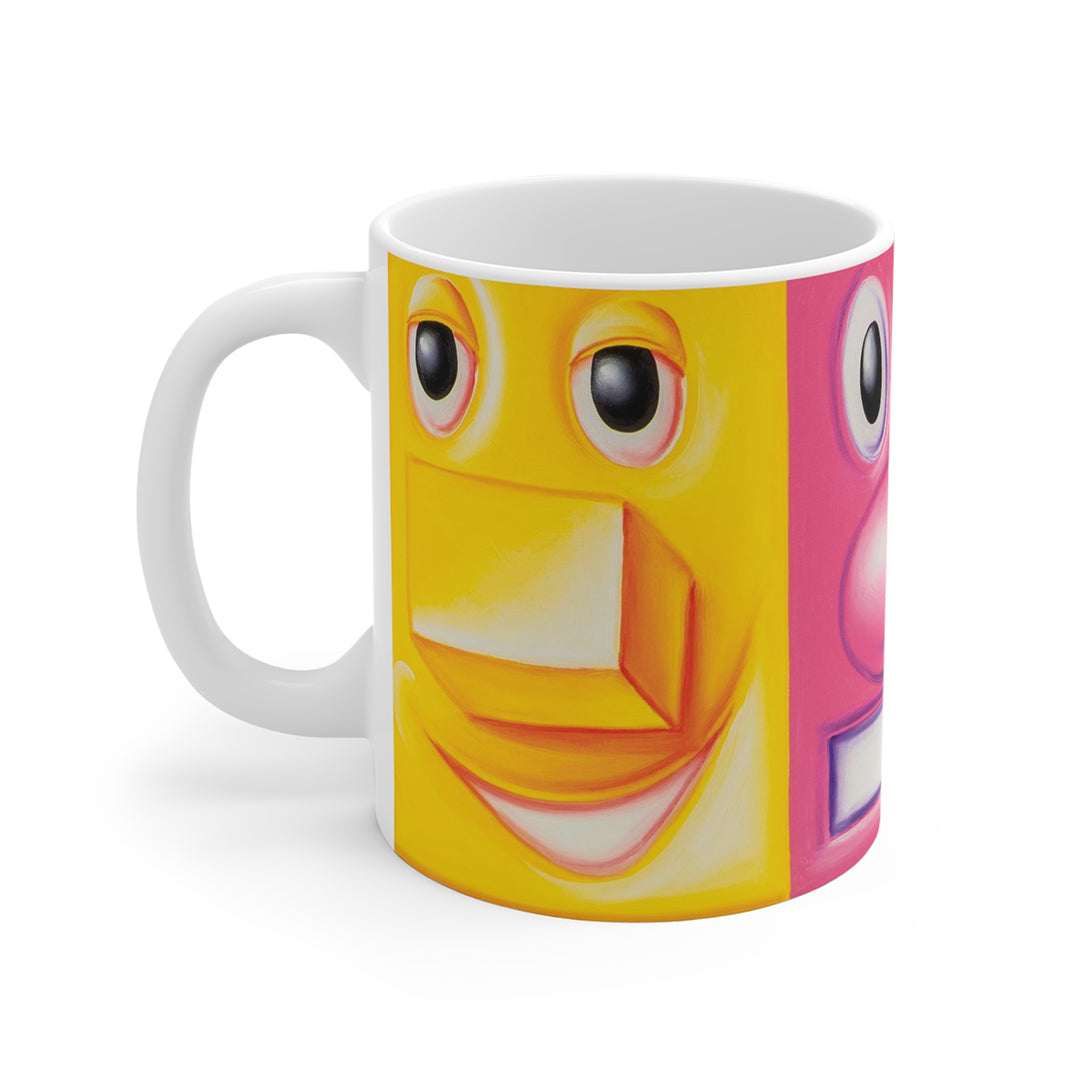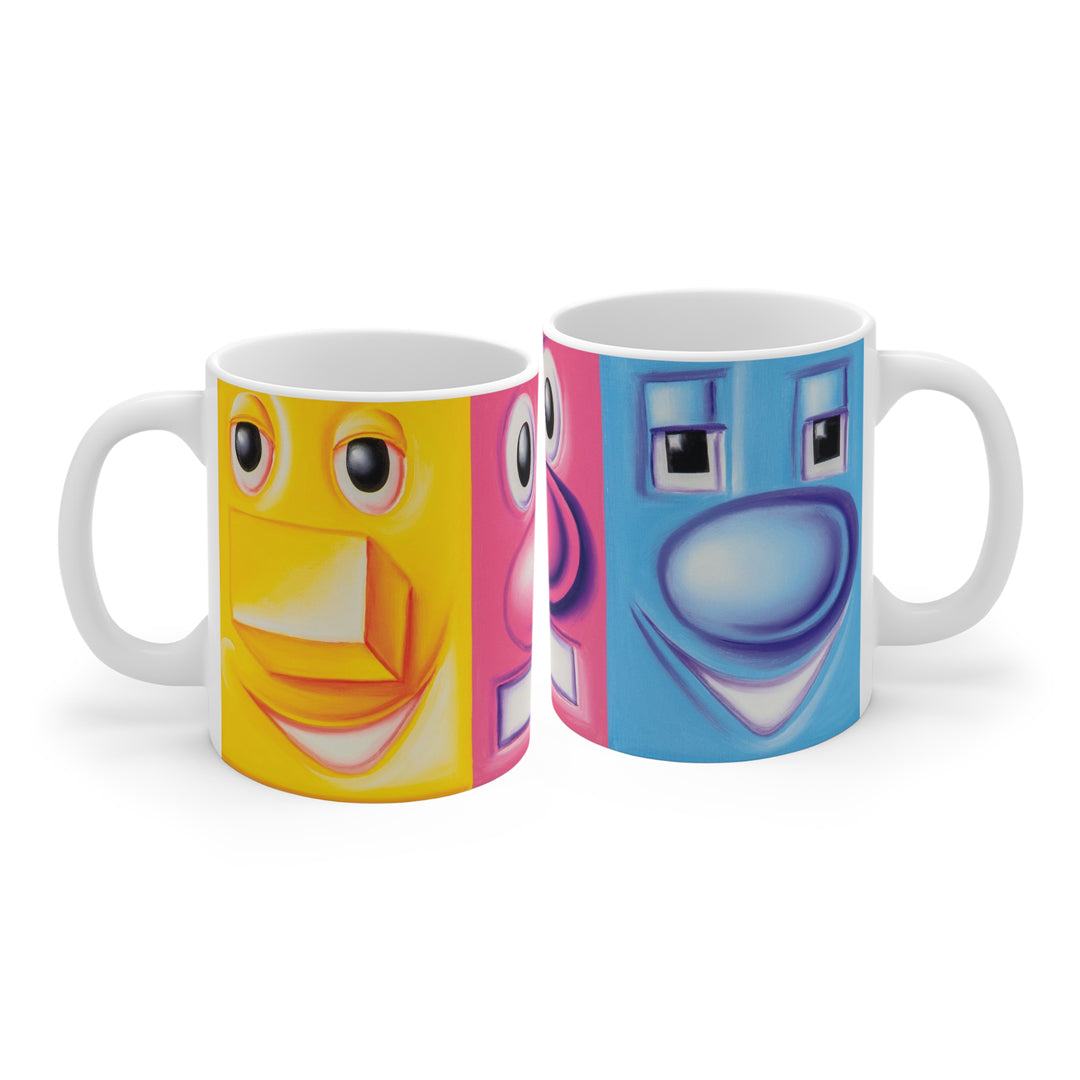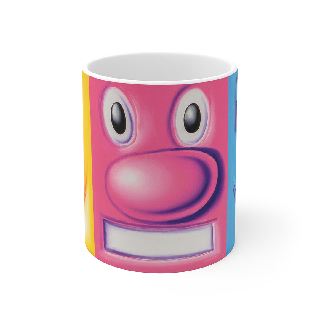 Serve up your favorite hot chocolate, coffee, or tea in this classic coffee shop style mug with artwork from the Kenny Scharf 2016 painting “HEDZ”. Three faces to keep an eye on your every sip. Which face are you in the morning?